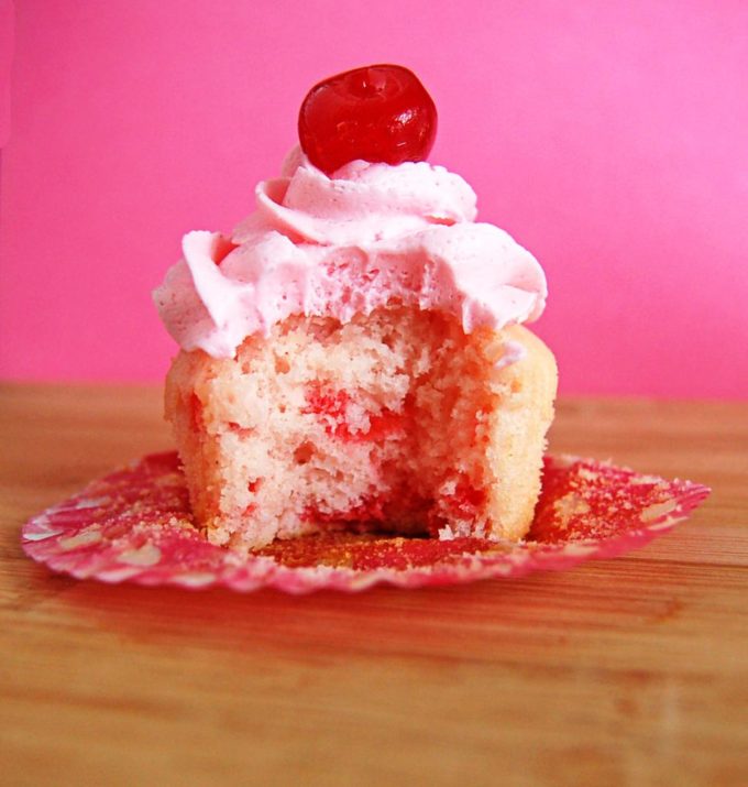 I’ve recently had this ridiculous desire for cherry chip cupcakes. This is about the only type of cake I’m willing to buy the mix for, simply because I never thought it possible to make from scratch. And also maybe because the boxed stuff is actually pretty fabulous! But since I’m a grown up, and I like a little challenge and adventure, I set out to find that perfect recipe. There are a few out there, but none seemed to really peak my interest. Mostly because they use some form of “cherry chip” in a bag, sort of like chocolate chips, and I simply cannot find those where I live. Plus, that’s kind of like cheating, don’t you think?