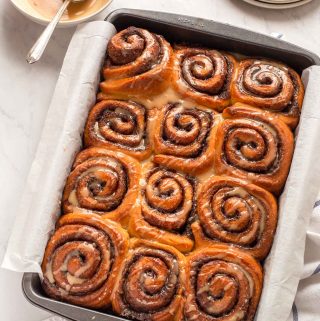 The dough for these maple coffee cinnamon rolls is a lovely enriched dough made with milk, butter and eggs. Using rich ingredients makes for a luscious and soft roll with lots of flavour. Instead of melting the butter, I like to add it while still solid (but very soft). By doing this, the water in the butter doesn’t contribute to the gluten development, which keeps the dough super soft. If you melt the butter first, it separates the fat and water, and the water contributes to gluten development, which can result in a dryer, heavier final product.